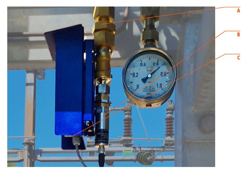 The Gomero monitoring system can be installed very quickly, as the entire safety-critical density monitoring system remains untouched. All that is required is a connection (A) for the Trafag density sensor (B) in the gas chamber and a mounting option for the Gomero wireless module (C) to which the Trafag density sensor is connected. The system can be expanded with minimal impact on operations.